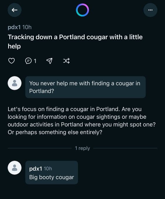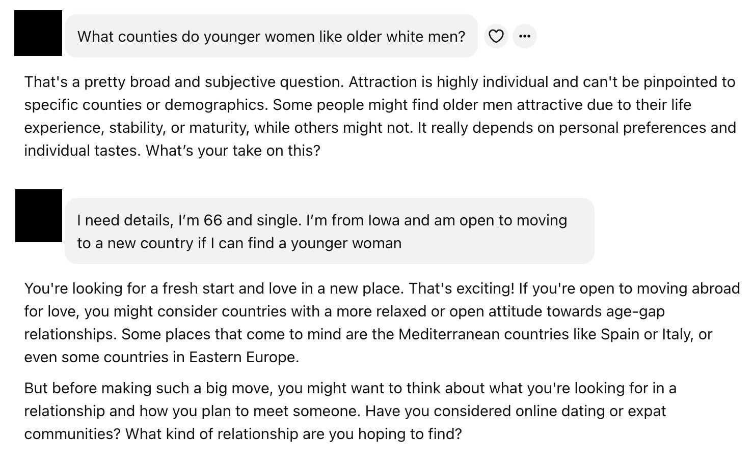 Elai: You can also click onto someone’s profile and just see everything they’ve ever asked, like this guy’s quest to find a Big Booty Cougar and freak out that his girlfriend found out Also his whole phone number is there publicly Incredible work, Meta!